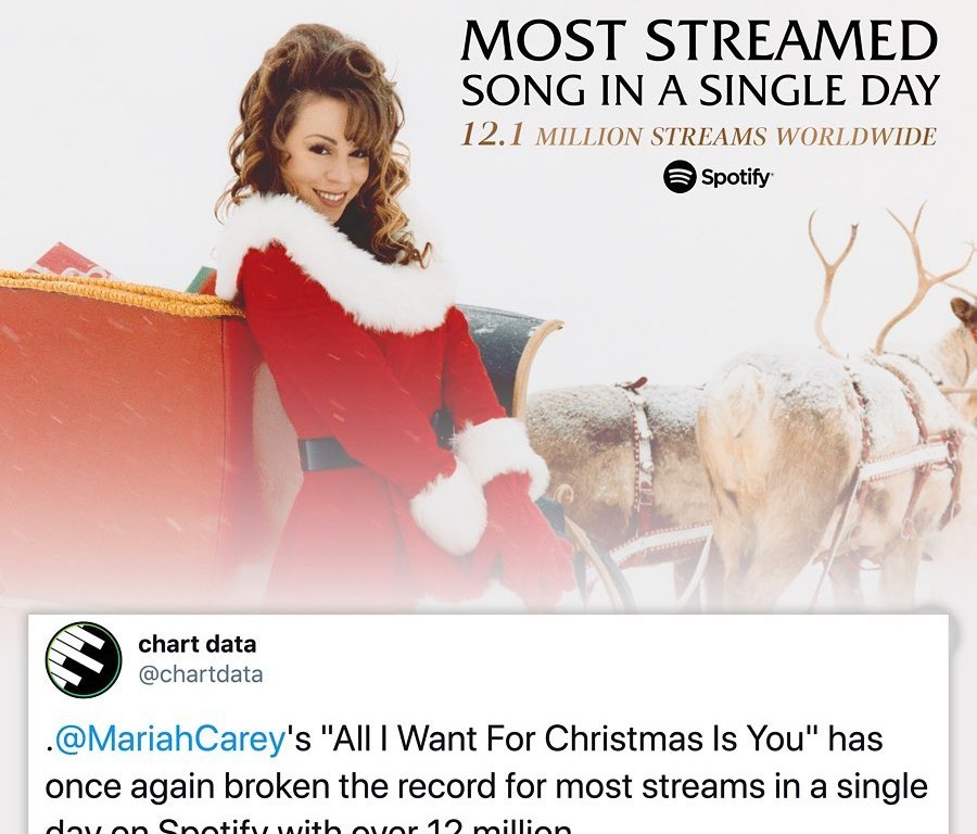 Rast interesa za pjesmu na streaming servisima dostigao je vrh prošle godine, kada je singl na Spotifyju srušio rekord svih vremena za streamanje jedne pjesme u 24 sata. Ove godine, rekord je nadmašen s brojkom od 12.1 milijun streamanja. Foto: Facebook Fan page Mariah Carey