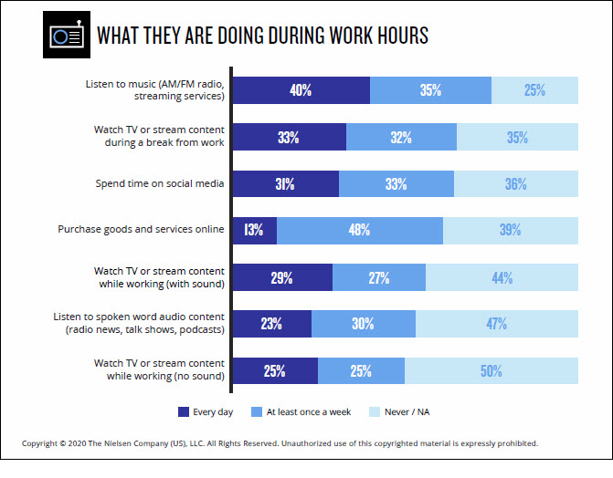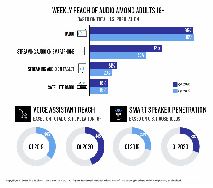 Total Audience Report agencije Nielsen – objavljen sredinom kolovoza – navodi kako tri četvrtine ljudi koji rade od kuće svojim omiljenim društvom smatraju zemaljski radio i glazbu putem streaming servisa. Takvi sadržaji daleko za sobom – za punih 10 posto – ostavljaju prve slijedeće kućne suputnike pri poslu, televizijske live ili streaming sadržaje odnosno društvene mreže. Britanski Radio Today, prenoseći izvještaj koji je naručila kompanija Global, navodi kako je slušanost najuspješnijih komercijalnih radijskih stanica na Otoku – uključujući Heart, Capital, LBC i Radio X – porasla od 13 do zadivljujućih 73 posto u odnosu na prethodno razdoblje. Postoci se razlikuju od stanice do stanice, ovisno i o podacima koji se mjere: dosegu slušatelja ili broju sati provedenih uz radio.