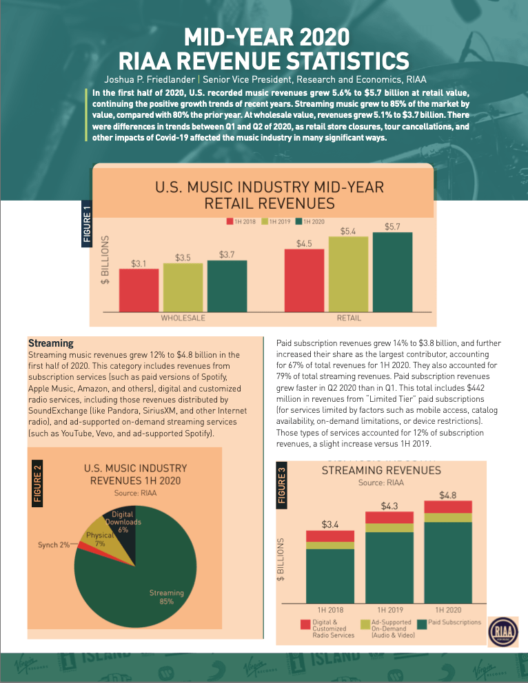 Rezultati izvještaja američke glazbene industrije pokazuju kako je i u uvjetima svjetske zdravstvene krize zadržan blagi rast prihoda. Rast iznosi 5.6 posto i dosiže maloprodajni prihod od 5.7 milijardi dolara, objavila je RIAA.