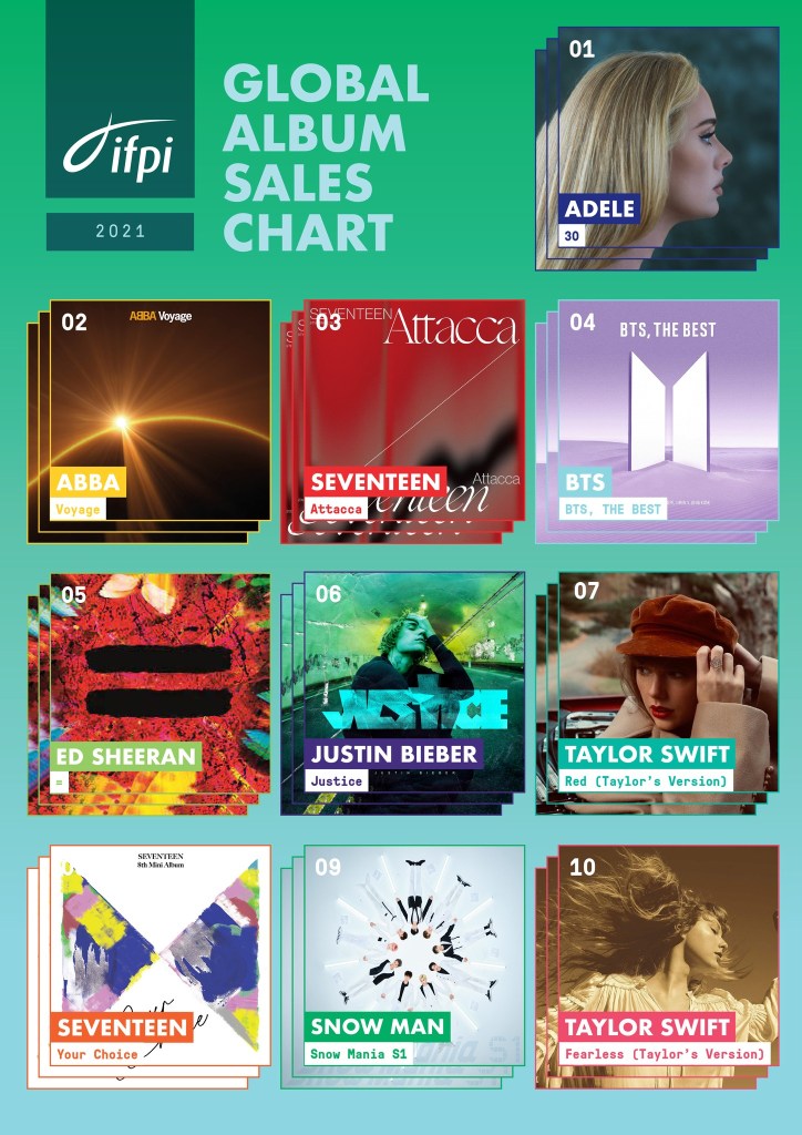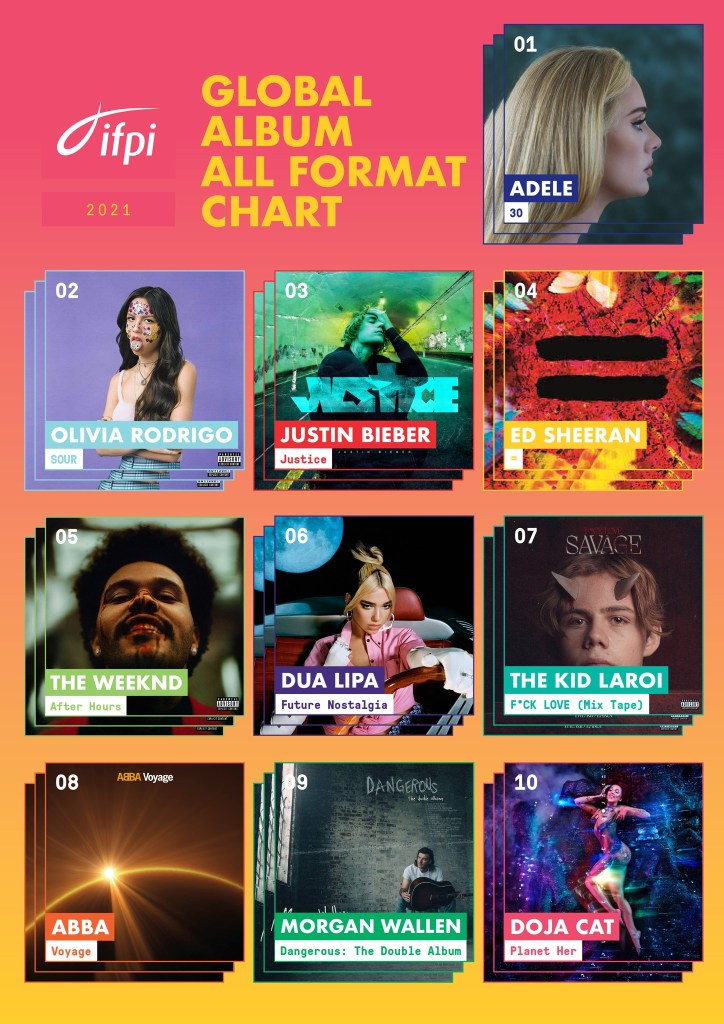 IFPI Global Album All Format Chart objedinjuje podatke fizičke i digitalne prodaje, ali i ekvivalentne prodajne rezultate na temelju uživanja u albumima na servisima za streamanje glazbe. Prema ukupnim podacima, drugo mjesto zauzela je Olivia Rodrigo s debi albumom ‘SOUR’, a treći je Justin Bieber s pločom ‘Justice’. Četvrto mjesto zauzeo je ‘=’ Eda Sheerana s kojega su do sada skinuta četiri Top 10 singla u Hrvatskoj, a peti je The Weeknd s pločom ‘After Hours’. S albuma ‘After Hours’ dolazi i godišnji broj jedan Airplay Radio Charta za 2021. godinu, singl ‘Save Your Tears’. Do desetog mjesta smjestili su se ‘Future Nostalgia’ (Dua Lipa), ‘F*ck Love’ (THE KID LAROI), ‘Voyage’ (ABBA), ‘Dangerous: The Double Album’ (Morgan Wallen) i ‘Planet Her’ (Doja Cat).
