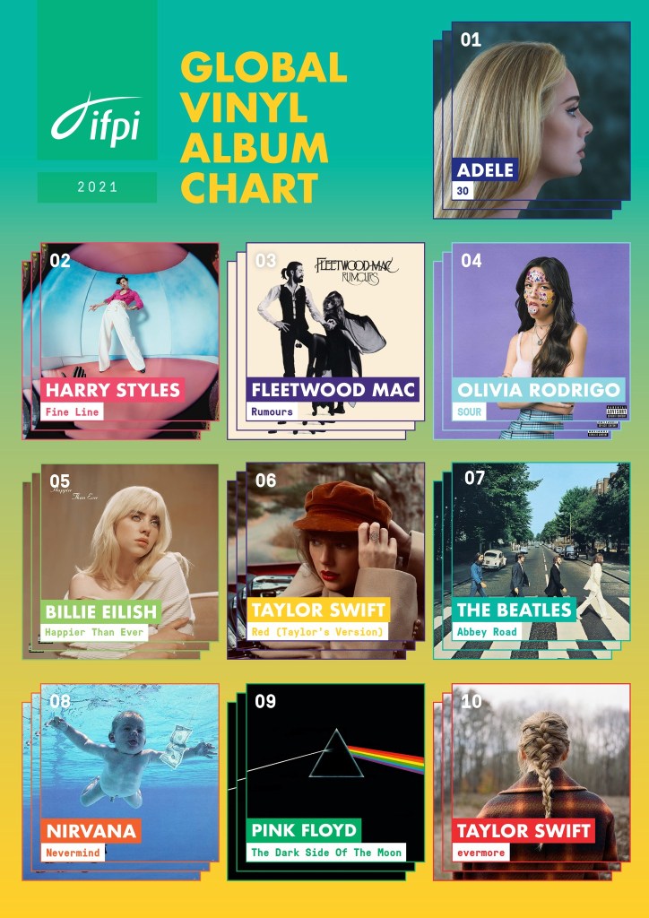 Kod prodaje vinilnih izdanja, međutim, vrijedi uočiti nekoliko zanimljivih trendova koji se očituju na listi IFPI Top 10 Global Vinyl Album Chart 2021, a oni se tiču kataloga, generacije Z i kraljeva prodaje albuma. Kraljevi su, zapravo, kraljice. Jedna je, dakako, Adele, a druga Taylor Swift. Američka kantautorica je na dvjema listama fizičke prodaje (ukupna i vinilna) zastupljena s tri albuma. ‘Red (Taylor’s Version)’ je na obje dok se na vinilnom chartu našao i ‘evermore’. Zanimljivost priče je i u tome da su sjajni rezultati postignuti s albumima različitog žanrovskog pristupa, umjetničkog koncepta i ukupne pojavnosti. Uz to, važan je i pristup pojedinim projektima. Ploča ‘evermore’ svoje vinilno izdanje imala je krajem svibnja uz primjerke s osobnim potpisom same Taylor Swift.