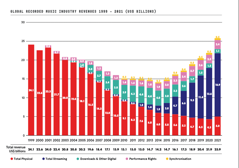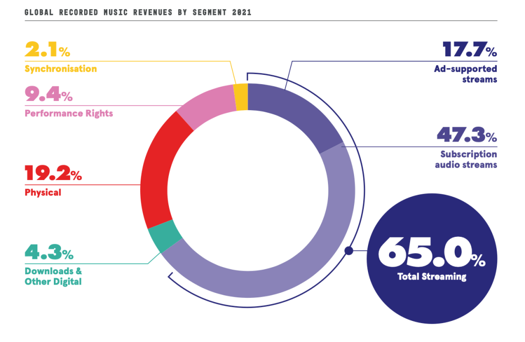 Porast pretplatnika na streaming servisima iznosi 80 milijuna i sada postoji 523 milijuna korisnika koji plaćaju servise za glazbeni streaming u odnosu na 443 milijuna koliko ih je bilo u 2020. godini. Svjetska diskografska federacija navodi kako je streaming vodeći format prihoda i da je prihod od snimljene glazbe porastao u svakoj svjetskoj regiji tijekom 2021. godine.