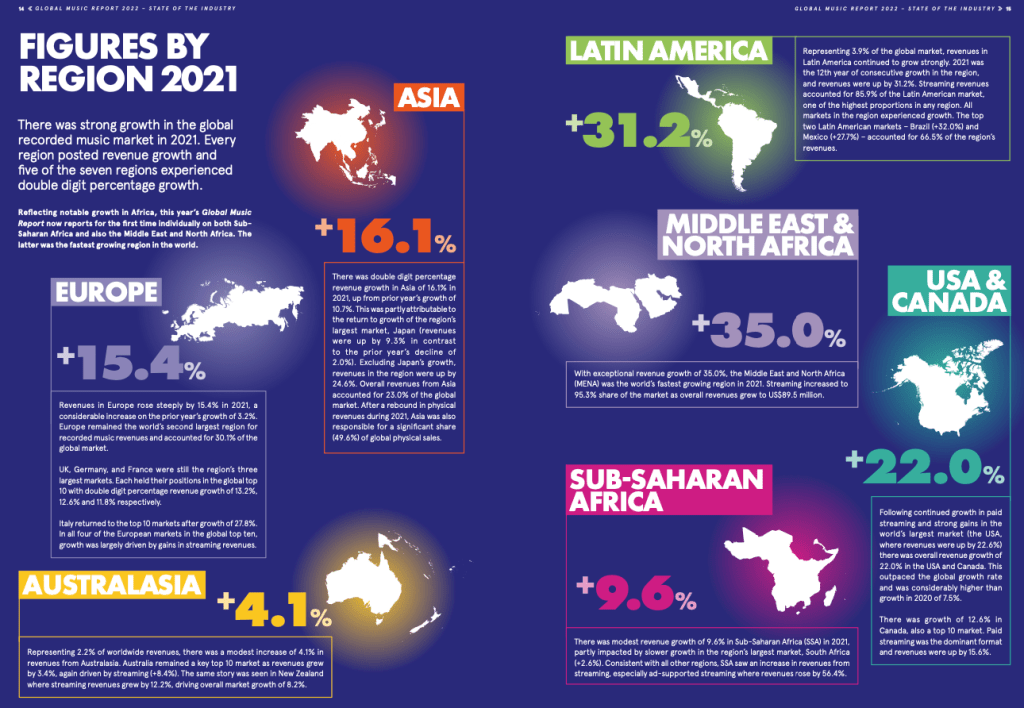 Bliski Istok i Sjeverna Afrika su prvi puta izdvojeni kao zasebna regija unutar Global Music Reporta, a doživjeli su najveću stopu regionalnog rasta u svijetu, a on iznosi 35 posto. Osobito snažan pokretač rasta bio je glazbeni streaming koji ima 95.3 posto udjela na tržištu. Podsaharska Afrika, također prvi puta izdvojena u godišnjem izvještaju, zabilježila je rast prihoda, uglavnom potaknutom streamingom, a on iznosi 9.6 posto. U ovoj regiji je posebno snažan rast prihoda od streamanja glazbe potpomognutom oglasima, a taj rast iznosi 56.4 posto.